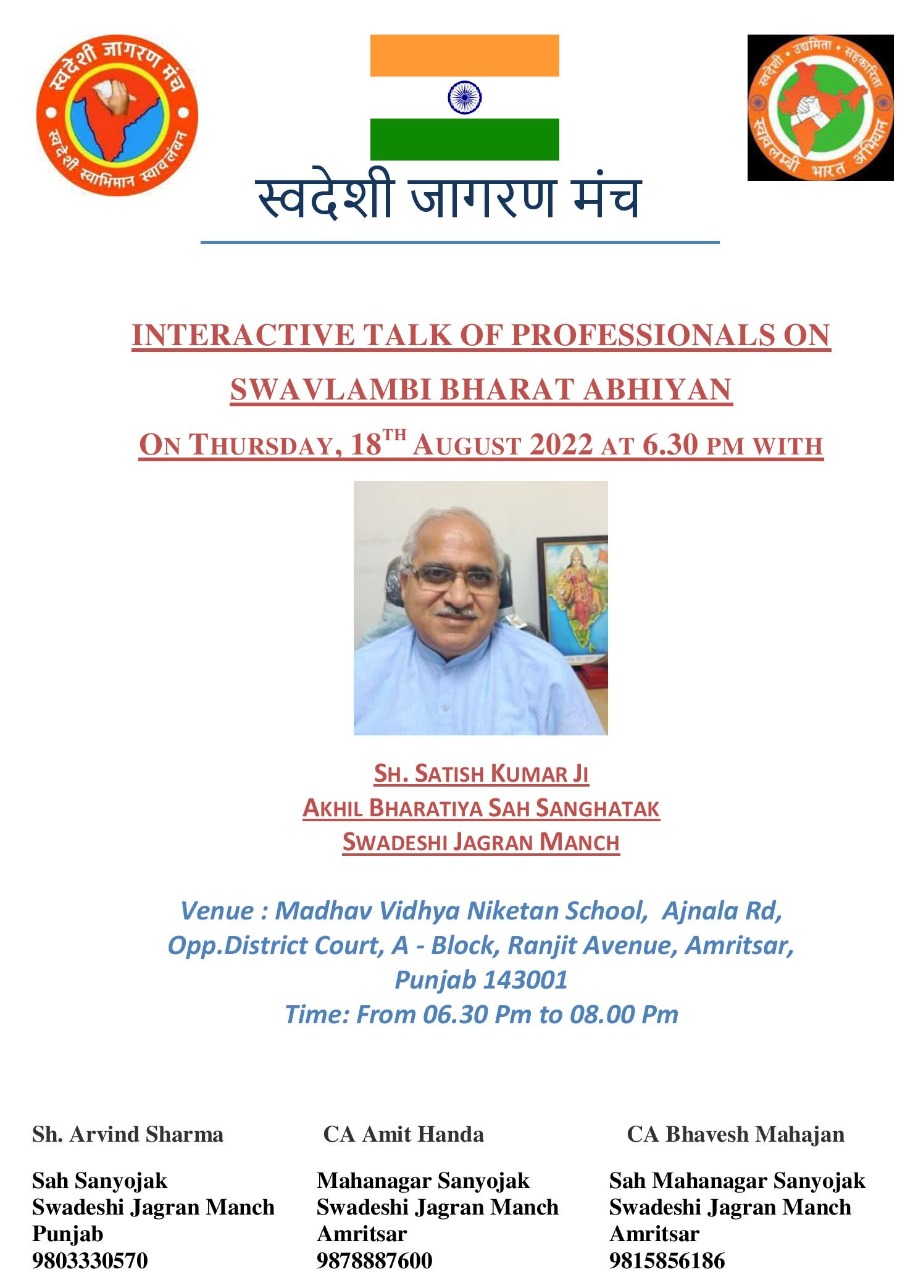 Interactive Talk of Professionals on Swavalambi Bharat Abhiyaan with Shri Satish Kumar ji Akhil Bhartiya Sah Sanghatak, Swadeshi Jagran Manch Shri Arvind Sharma Sah Sanyojak Swadeshi Jagran Manch, Punjab CA Amit Handa Mahanagar Sanyojak Swadeshi Jagran Manch, Amritsar CA Bhavesh Mahajan Sah Mahanagar Sanyojak Swadeshi Jagran Manch, Amritsar