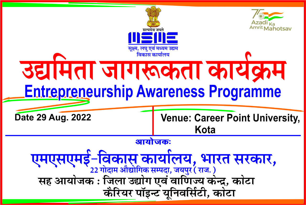 MSME -DO(Ministry of MSME - Govt of India) jaipur in association with Career Point University Kota and DIC Kota is proposed to organise Entrepreneurship Awareness Programme for youth at Career Point University Kota dated 29August 2022at 11AM . The objective of this programme is to make awareness of different schemes of Govt. of India and State Govt. for benefit of prospective entrepreneur. You are requested to register by sending registration form to email id dcdi-jaipur@dcmsme.gov.in