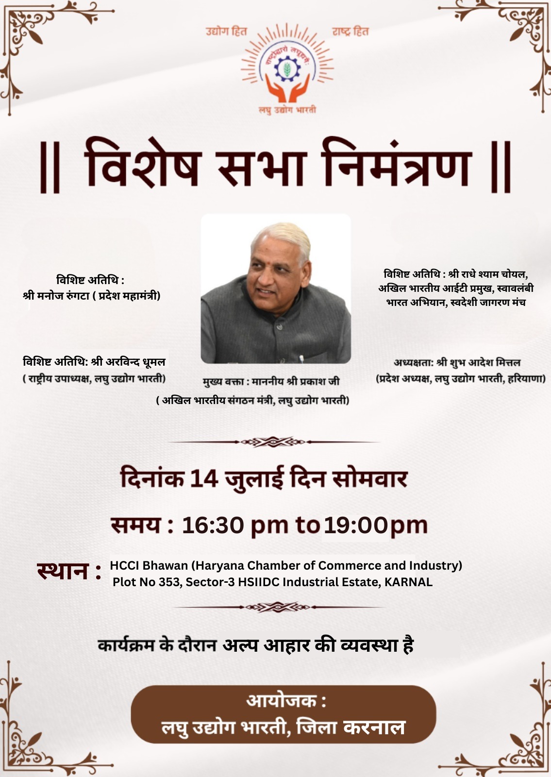 विशेष सभा का आयोजन लघु उद्योग भारती, जिला करनाल द्वारा 14 जुलाई को HCCI भवन (करनाल) में किया जा रहा है। यह सभा स्वावलंबी भारत और स्वदेशी अभियान को आगे बढ़ाने के उद्देश्य से आयोजित की गई है, जिसमें प्रमुख अतिथियों द्वारा प्रेरणादायक उद्बोधन दिए जाएंगे।